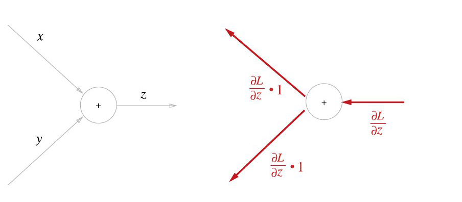 - 수학적 근거: $\frac{\partial}{\partial x}(x + y) = 1$, $\frac{\partial}{\partial y}(x + y) = 1$