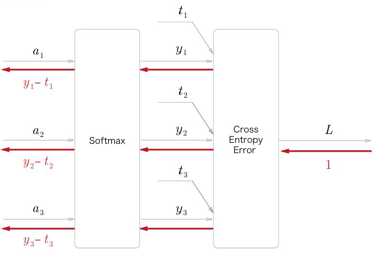 놀라운 결과: Softmax 계층의 역전파는 $(y_1 - t_1, y_2 - t_2, y_3 - t_3)$라는 말끔한 결과를 낸다.