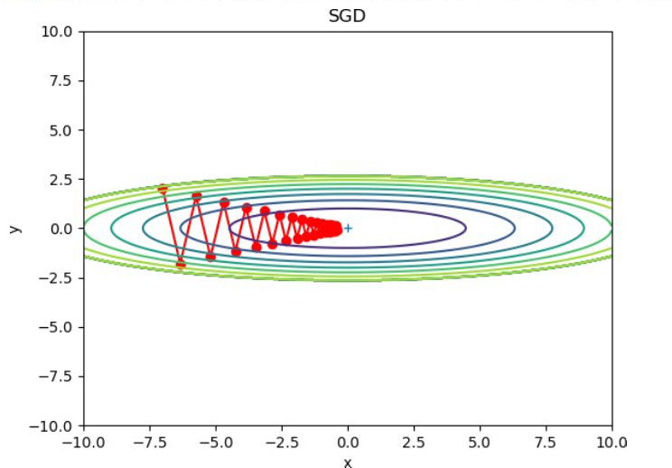 SGD에 의한 최적화 갱신 경로: 최솟값인 (0, 0)까지 지그재그로 이동하니 비효율적이다.