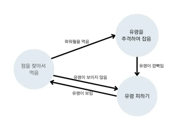 팩맨의 유령들은 ‘추격’, ‘도망’, ‘집으로 돌아가기’ 등의 상태를 가지며, 특정 조건에 따라 상태를 전환한다.